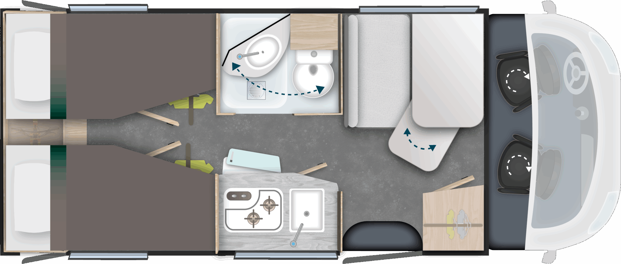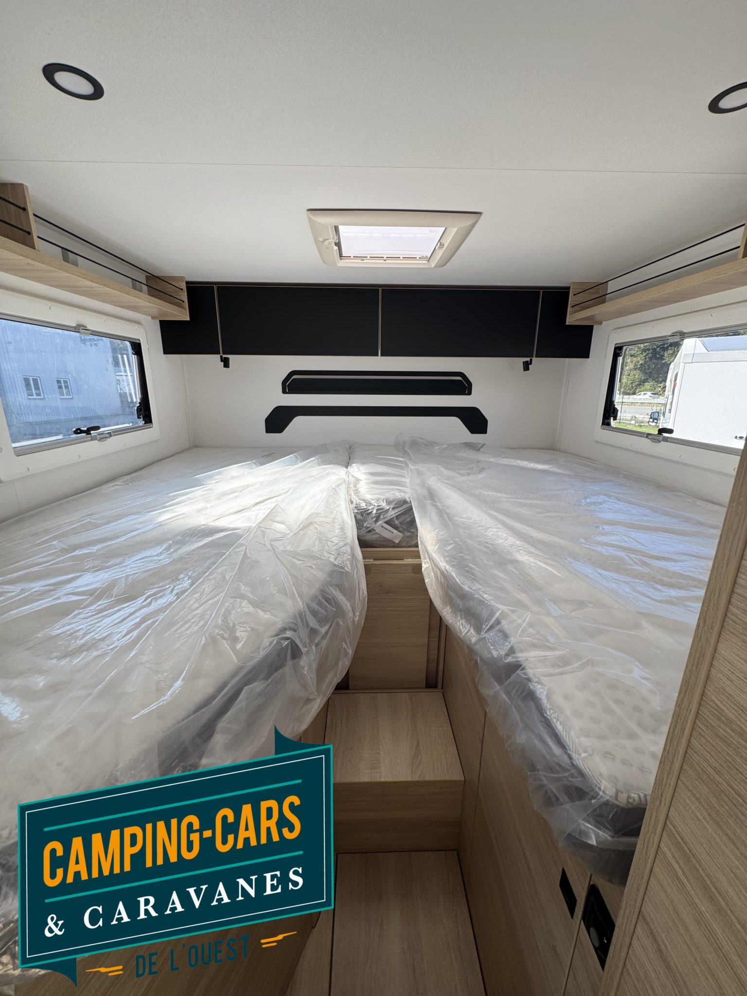 – Pack Accessoires : Store extérieur, Panneau solaire 140W, Moustiquaire de porte, Stores intérieur cabine, Complément couchage dinette, Compléments couchage lits jumeaux, Kit pose 2ème batterie (3 000€)