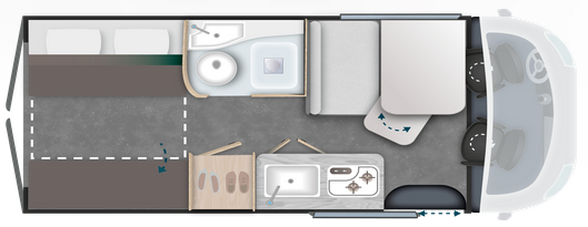 C’est le grand frère du V594S, décliné ici en 5.99 mètres offrant ainsi plus d’espace et la possibilité d’un couchage d’appoint pour un enfant. Astucieuse salle de bains (avec douche, lavabo et WC) et lit arrière de grande dimension, relevable si besoin d’espace. Assurément l’un des plans les plus éprouvés (et appréciés) sur le marché du fourgon aménagé.