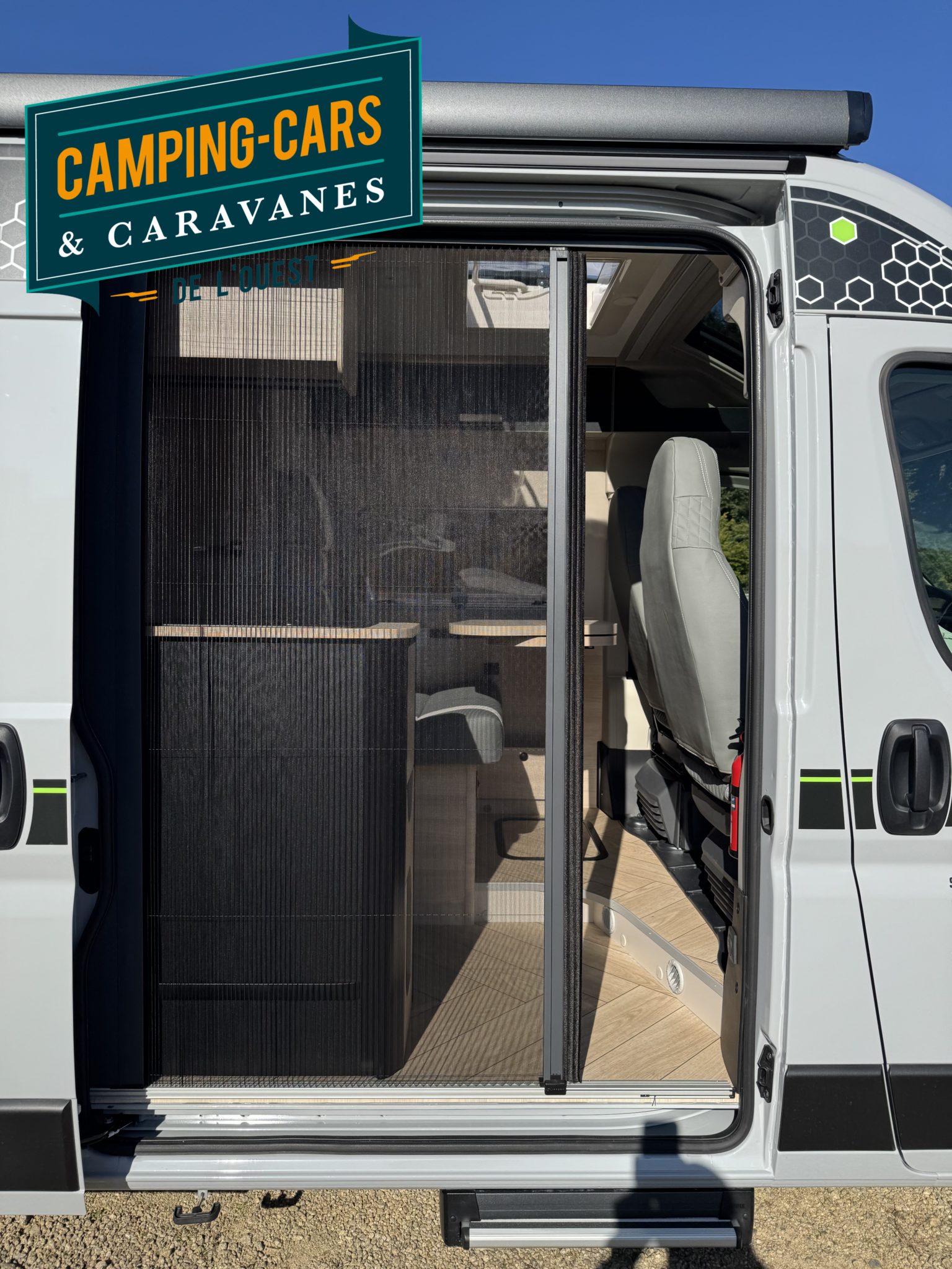 – Pack Accessoires : Store extérieur, Panneau solaire 200W, Éclairage extérieur porte d’entrée, Moustiquaire de porte, Stores intérieur cabine, Compléments couchage dinette (3 000€)