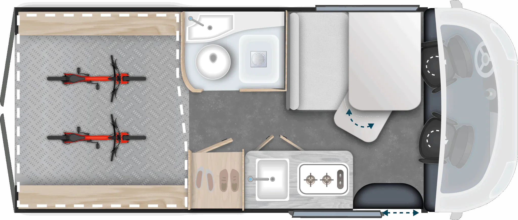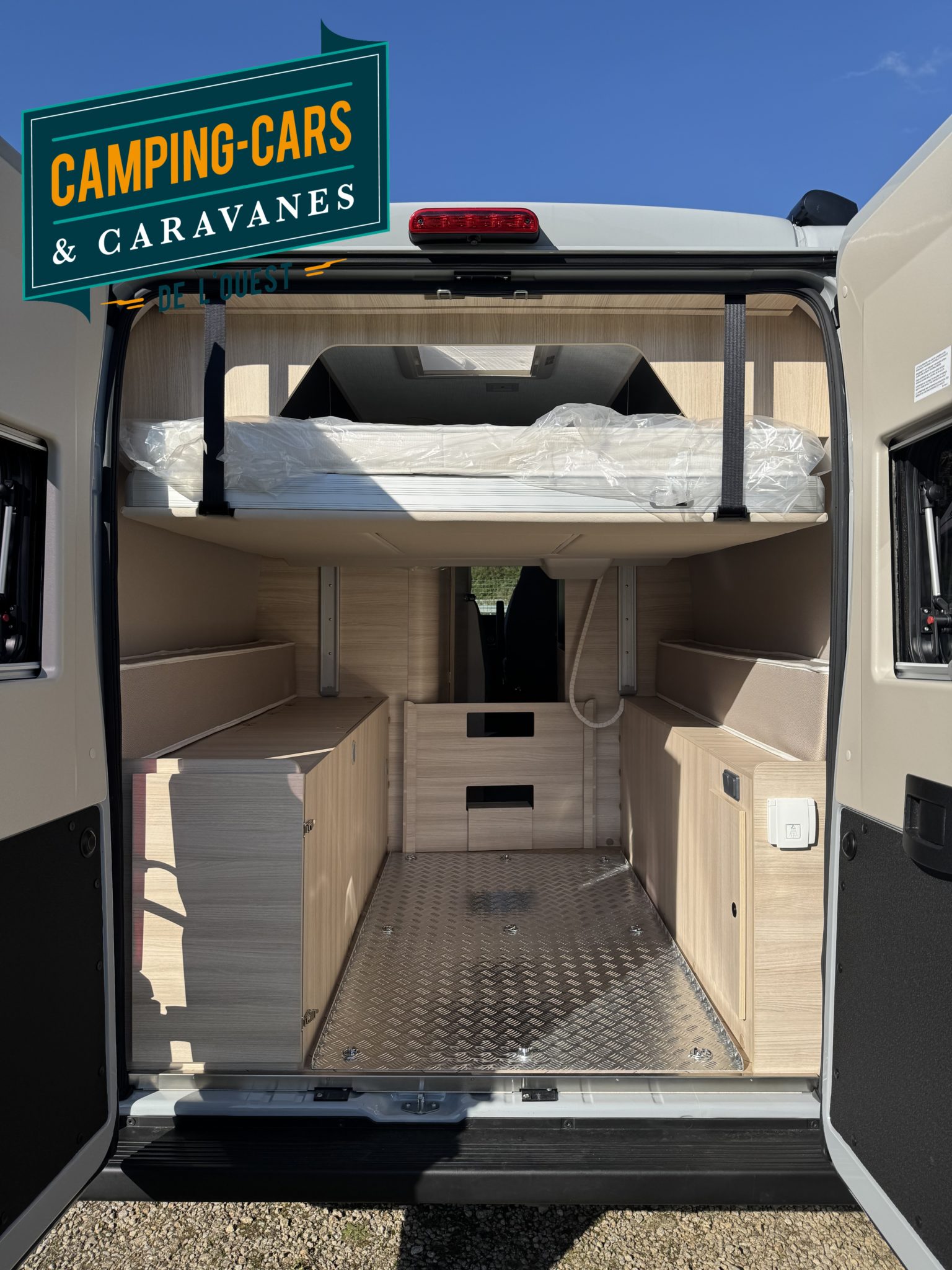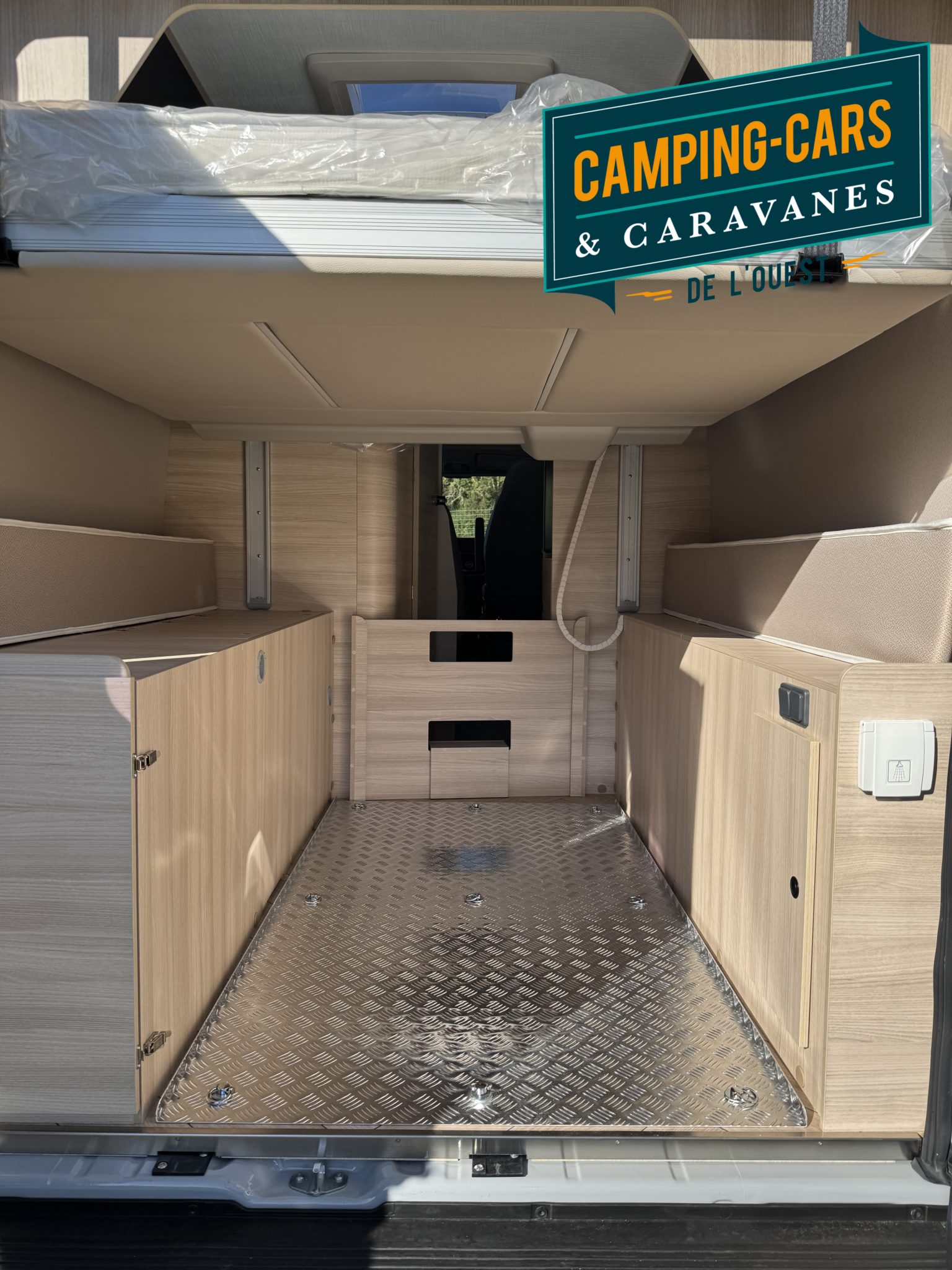 Jusqu’alors, dans un van, il fallait choisir entre garage et couchage. Le V690 est doté d’un véritable garage et d’un véritable couchage aux dimensions XXL. Son secret ? Un lit de pavillon électrique (au-dessus du garage) qui peut être accessible sans échelle si le garage n’est pas utilisé.