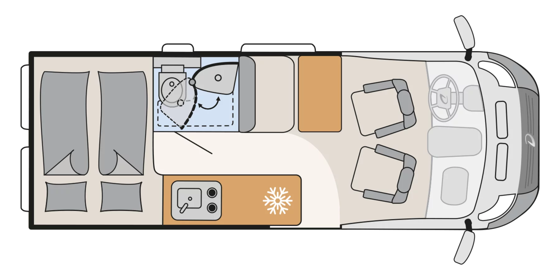 – Pack Active : Jantes aluminium 16 », Volant et pommeau de levier de vitesses en cuir, Techno Trim, Support tablette, antenne DAB dans le rétroviseur, haut-parleurs, commandes radio au volant, Store plissé dans la cabine de conduite : pare-brise avant, Stores plissés dans la cabine de conduite : vitres latérales, Moustiquaire de porte, Marchepied électrique, Baie dans cabinet de toilette, Lanterneau Midi-Heki 70 x 50 cm au-dessus de la dînette avec moustiquaire et store occultant, Rallonge de table pivotante, Pré-câblage pour caméra de recul, Pré-équipement pour panneaux solaires, Pré-équipement TV 12V & prise TV, raccordement satellite, Bandes lumineuses à LED, Prise 230V dans le meuble haut avant gauche (dînette), Prise 12V à l’arrière, en bas à gauche, Double prise USB dans la partie arrière gauche (3 095€)
