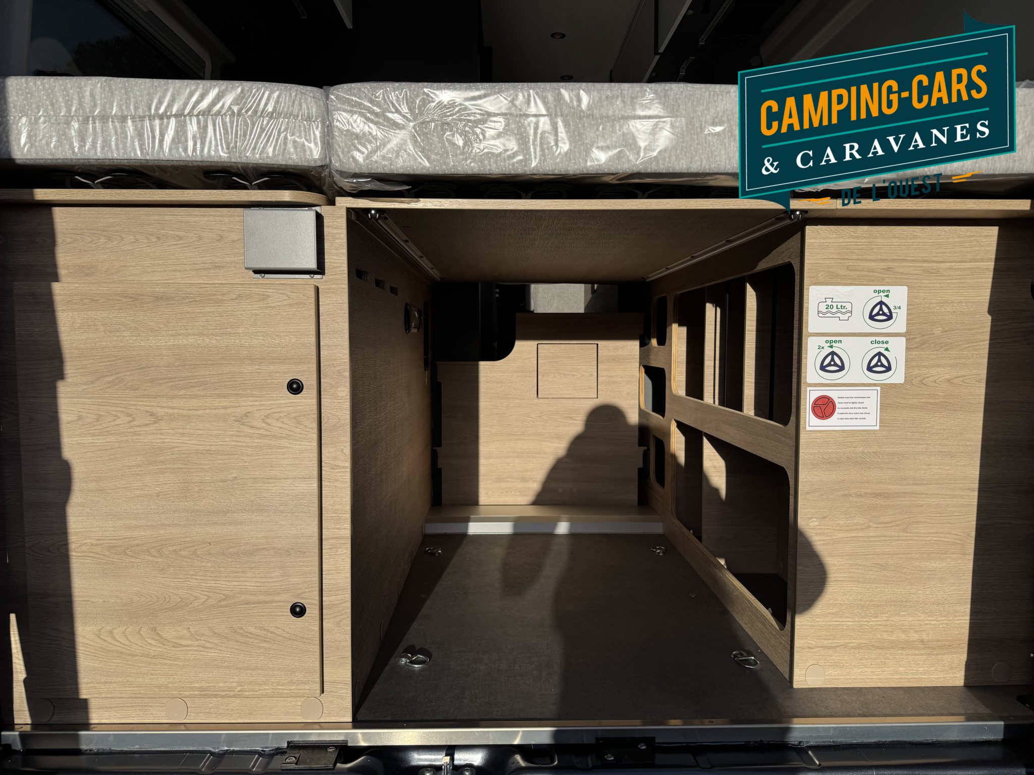 – Rangement ouvert sous les placards de pavillon, côté gauche du lit