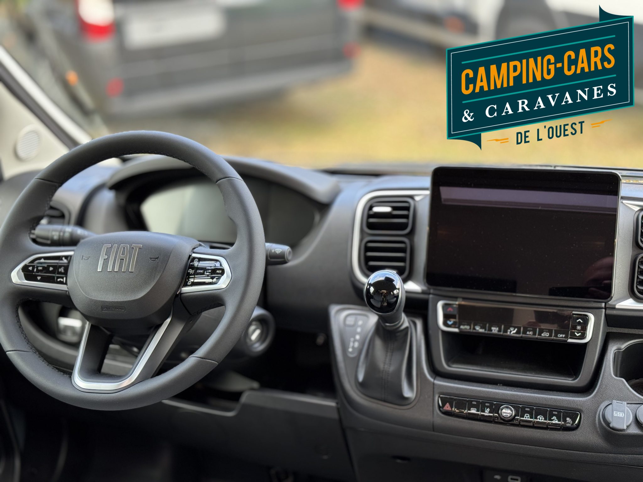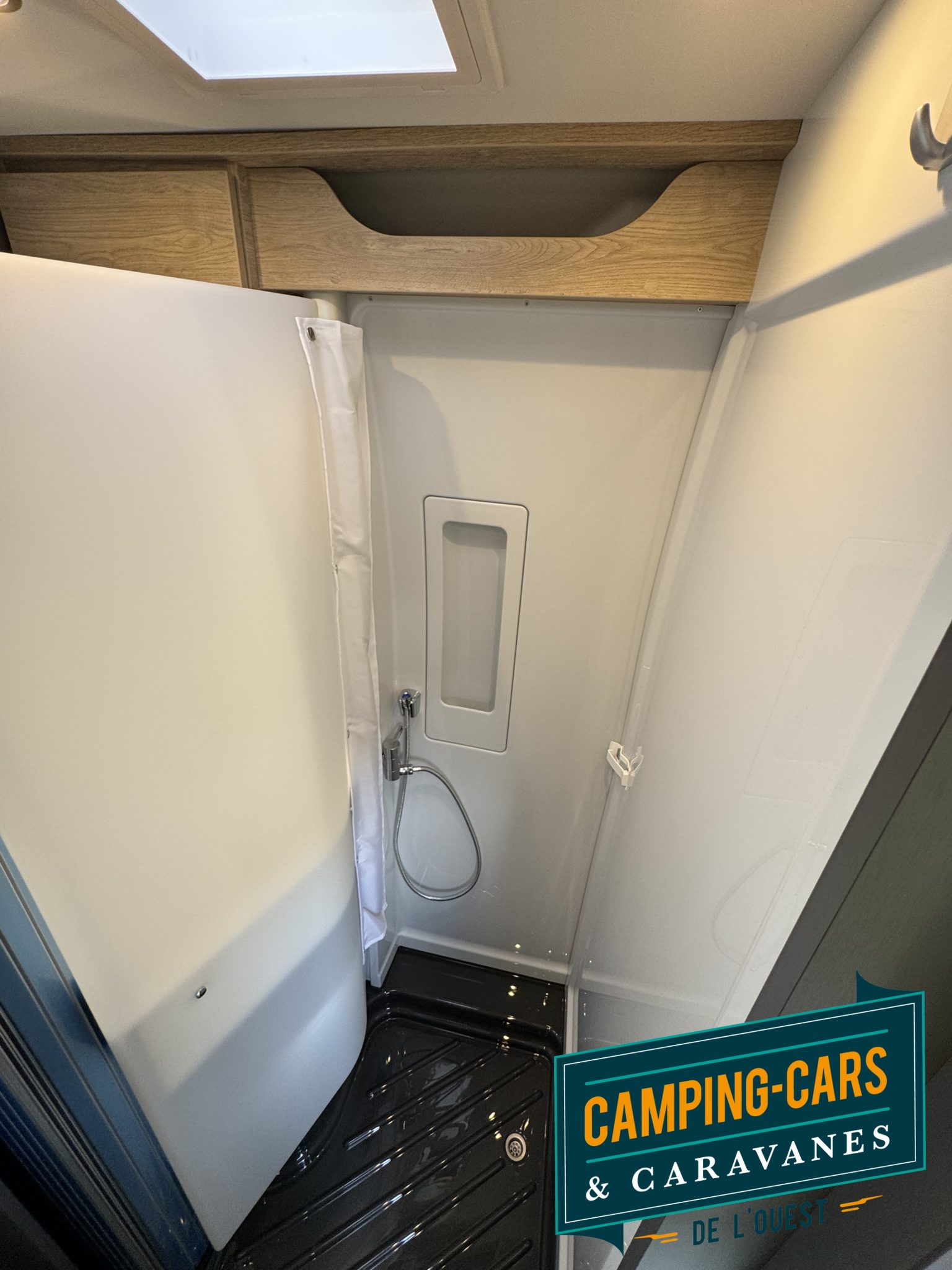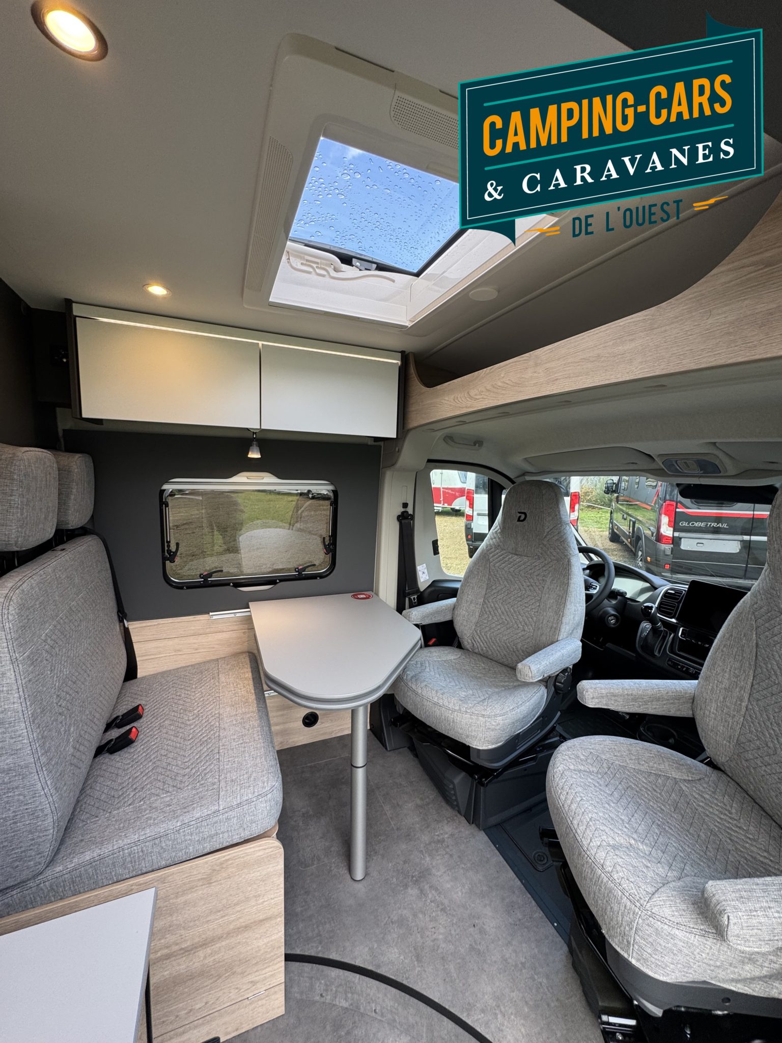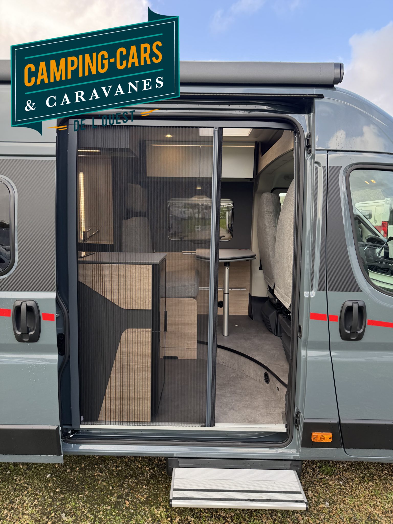 vitesse adaptatif ACC), Pack Vision niveau 2 (rétroviseurs latéraux rabattables, capteurs de stationnement, assistant d’angle mort), Climatisation automatique, Caméra de recul digitale, Tableau de bord digital, Radionavigation & écran 10 pouces, Chargeur de téléphone sans fil, Stickage extérieur complet, Eclairage d’auvent, Eclairage indirect, Bandes lumineuses à LED, Pré-équipement pour panneaux solaires, Commande Truma CP Plus, Prise 230V dans le meuble haut avant gauche (dînette), Prise 12V à l’arrière, en bas à gauche, Double prise USB dans la partie arrière gauche, Baie avec moustiquaire et store occultant à l’arrière côté gauche, Rallonge de table pivotante, Store 4,00 m (3 440€)