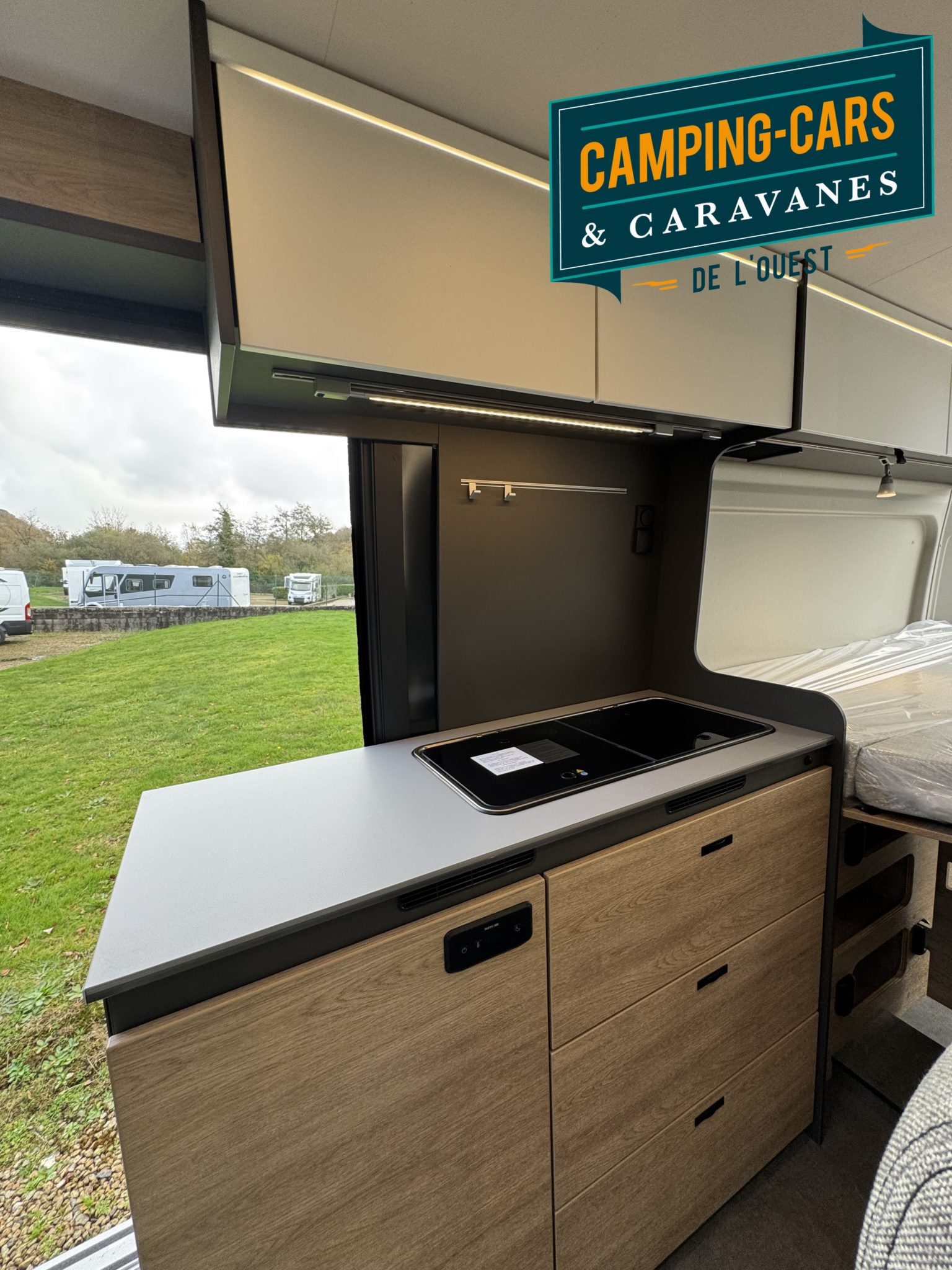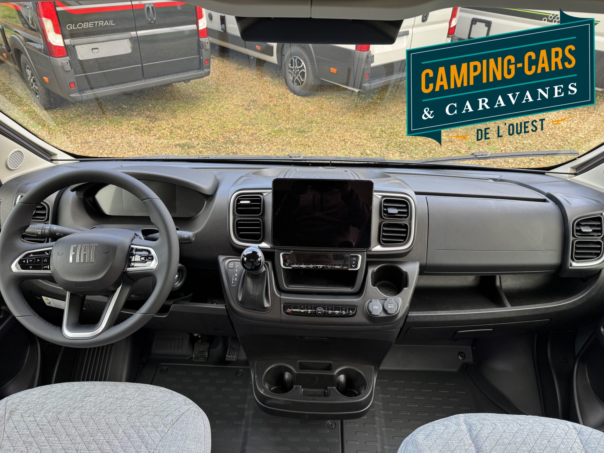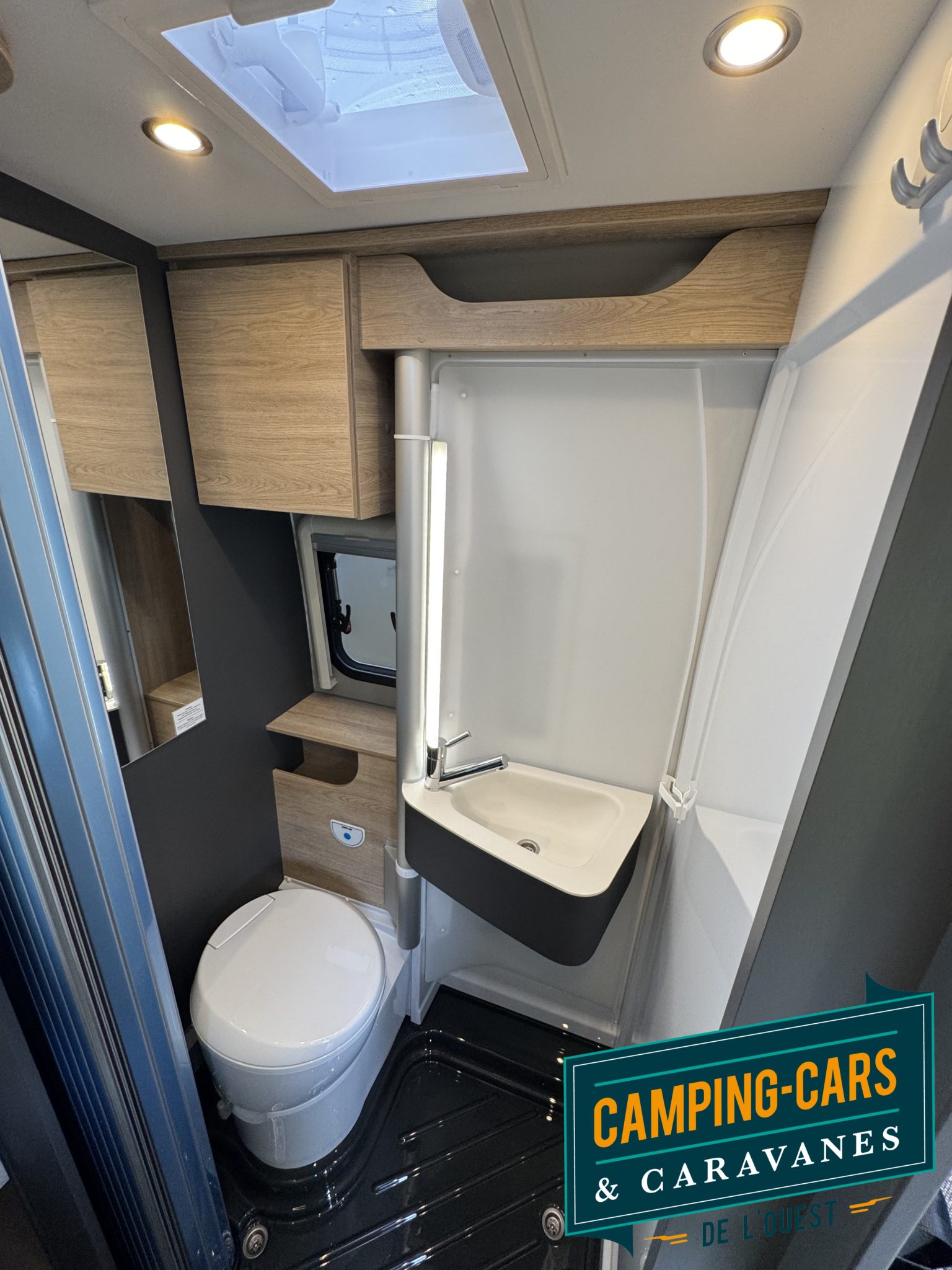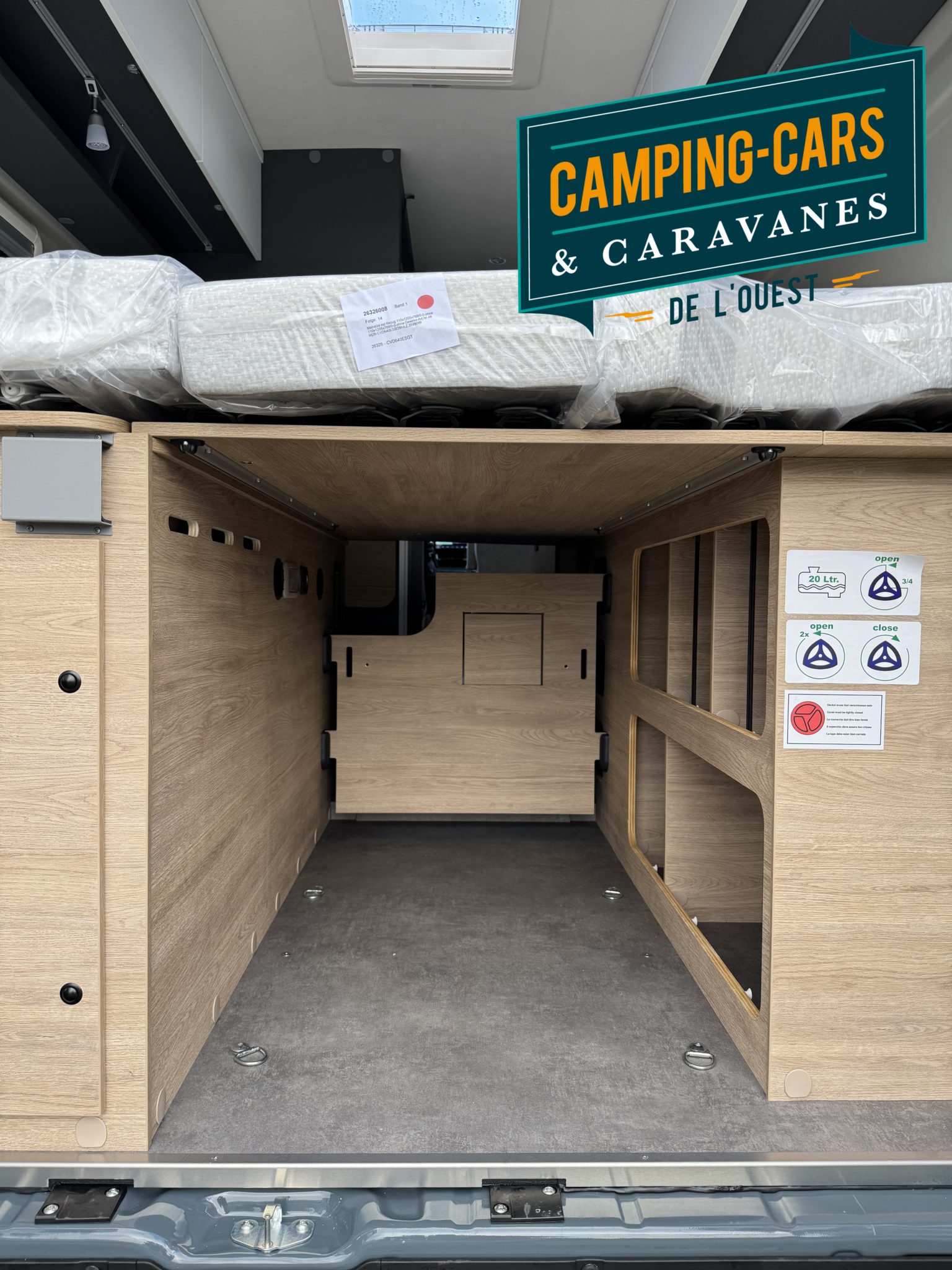 vitesse adaptatif ACC), Pack Vision niveau 2 (rétroviseurs latéraux rabattables, capteurs de stationnement, assistant d’angle mort), Climatisation automatique, Caméra de recul digitale, Tableau de bord digital, Radionavigation & écran 10 pouces, Chargeur de téléphone sans fil, Stickage extérieur complet, Eclairage d’auvent, Eclairage indirect, Bandes lumineuses à LED, Pré-équipement pour panneaux solaires, Commande Truma CP Plus, Prise 230V dans le meuble haut avant gauche (dînette), Prise 12V à l’arrière, en bas à gauche, Double prise USB dans la partie arrière gauche, Baie avec moustiquaire et store occultant à l’arrière côté gauche, Rallonge de table pivotante, Store 4,00 m (3 440€)
