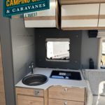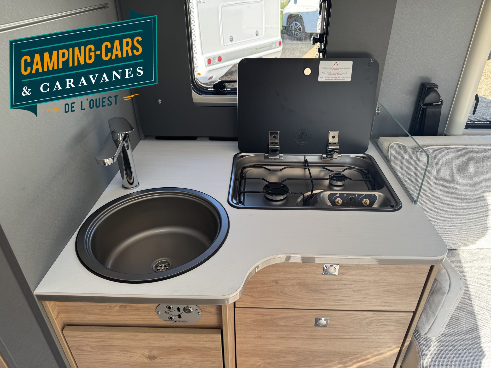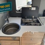 – Bloc-cuisine avec plaque de cuisson 2 feux, grands et profonds tiroirs coulissants avec freins (Softclose) et vaste plan de travail