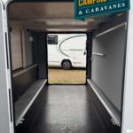 + Immense soute arrière chauffée avec charge utile de 250 kg, chargement possible des deux côtés, revêtement de sol antidérapant, rails d’arrimage, éclairage, prise de courant 230 V