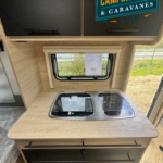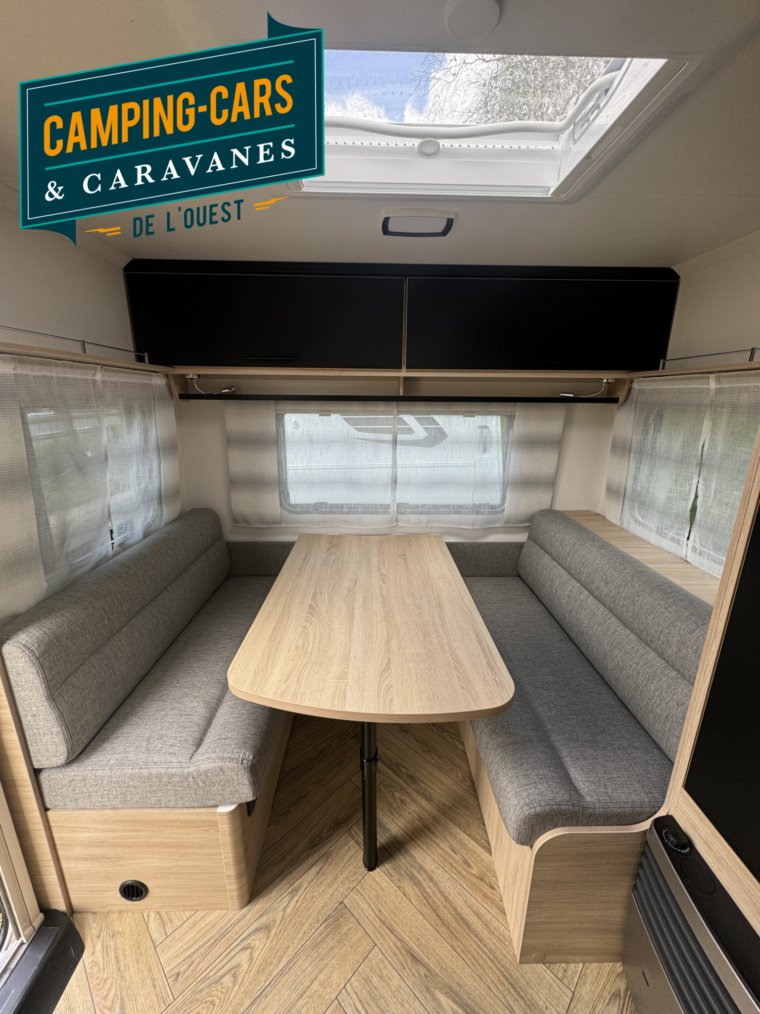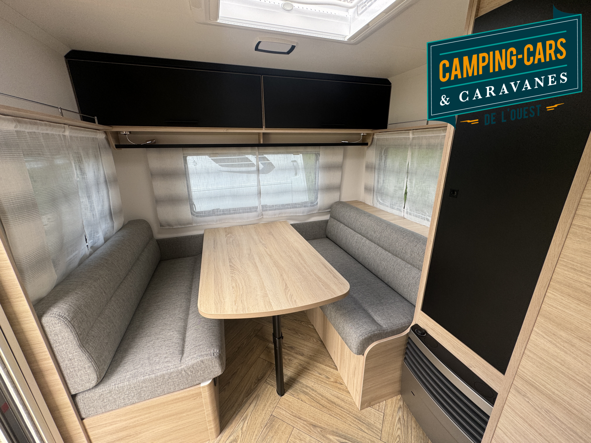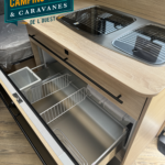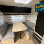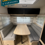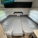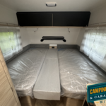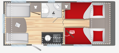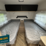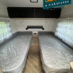 Salon en face à face très “cosy”, ses lits jumeaux très confortables, sa belle capacité de rangement sous les lits, son réfrigérateur XL-Freeze de 150 L, son chauffage et air pulsé et son pré-équipement pour le porte-vélos de série, cette caravane ne manque de rien !