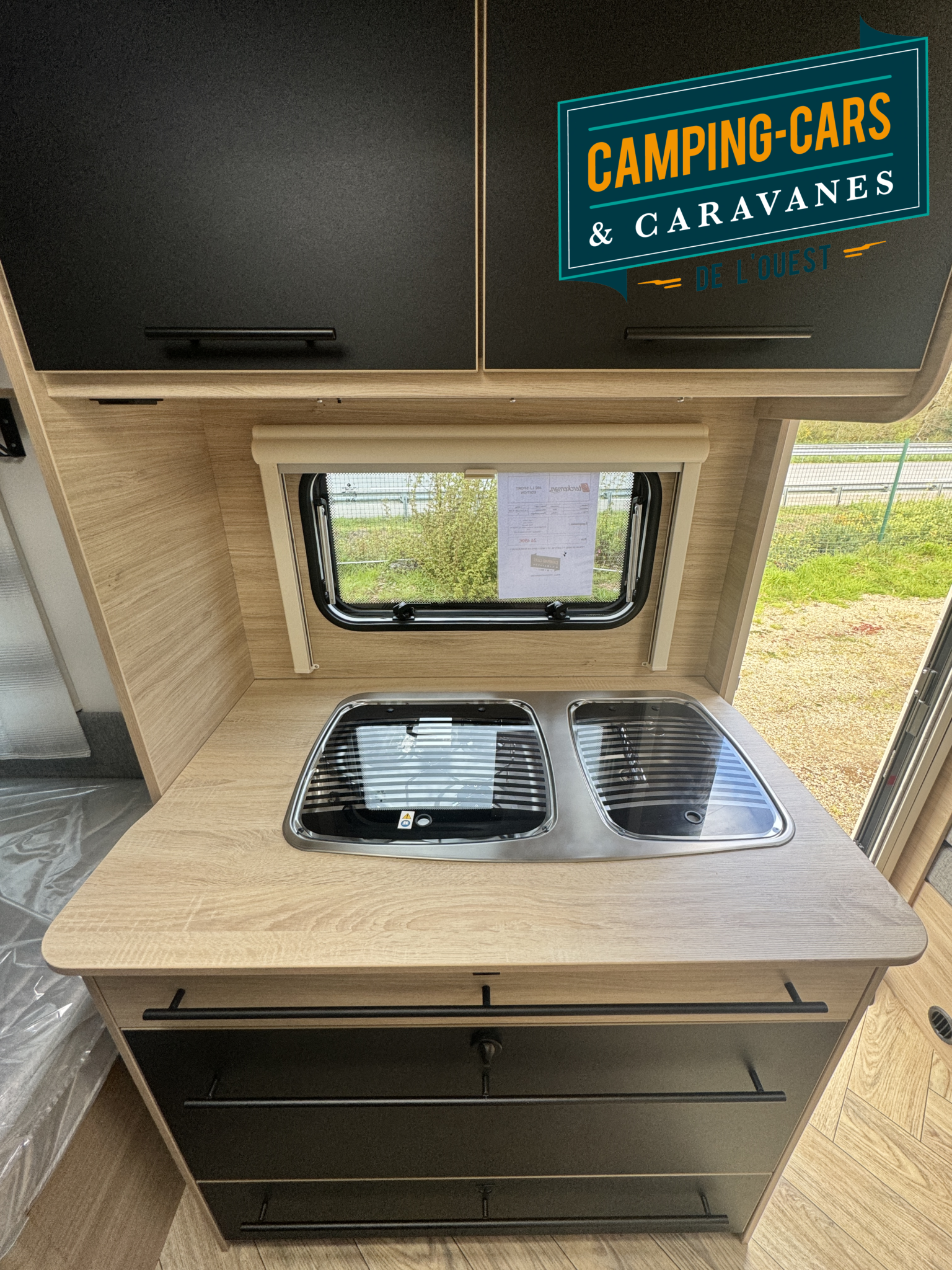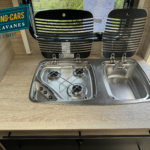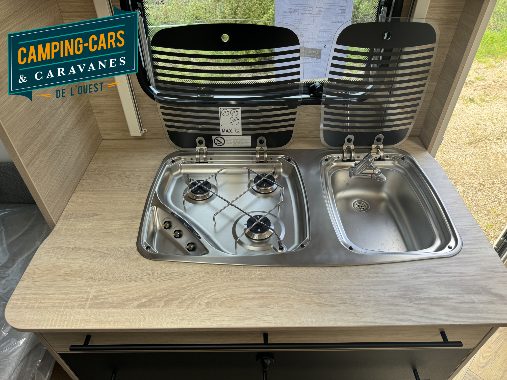 – Combiné réchaud 3 feux et cuve évier inox avec couvercle verre