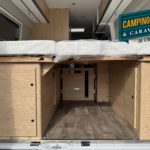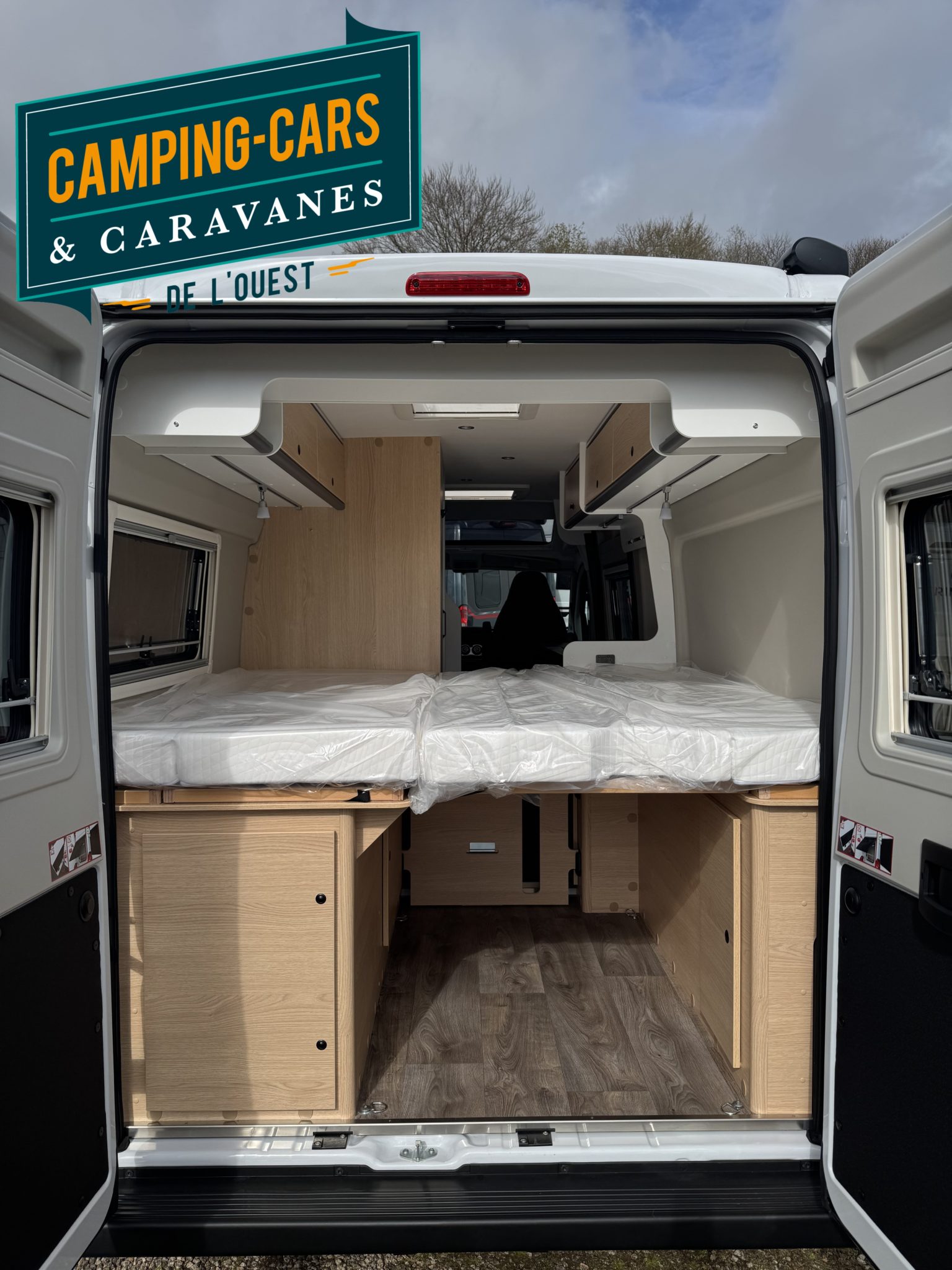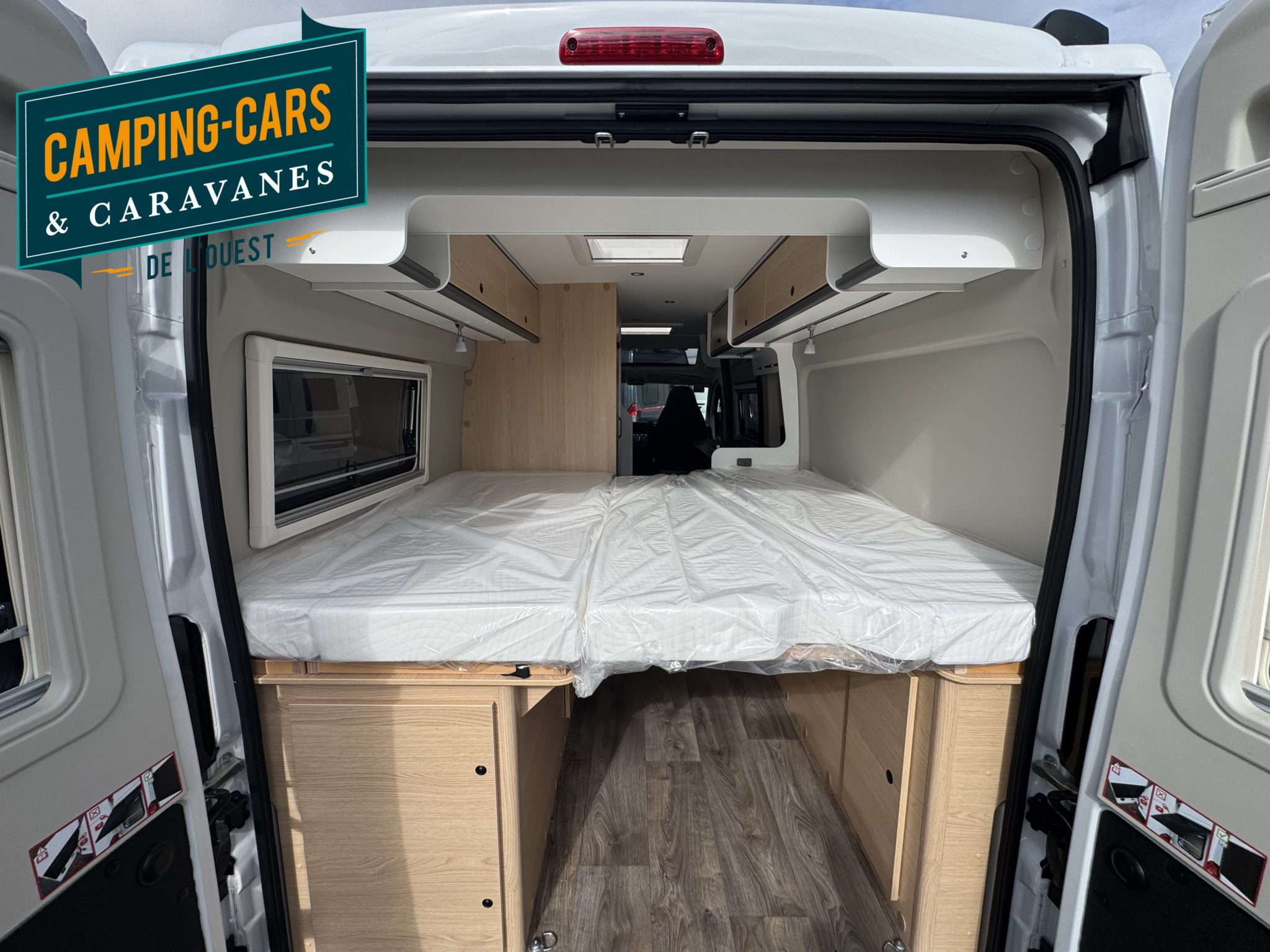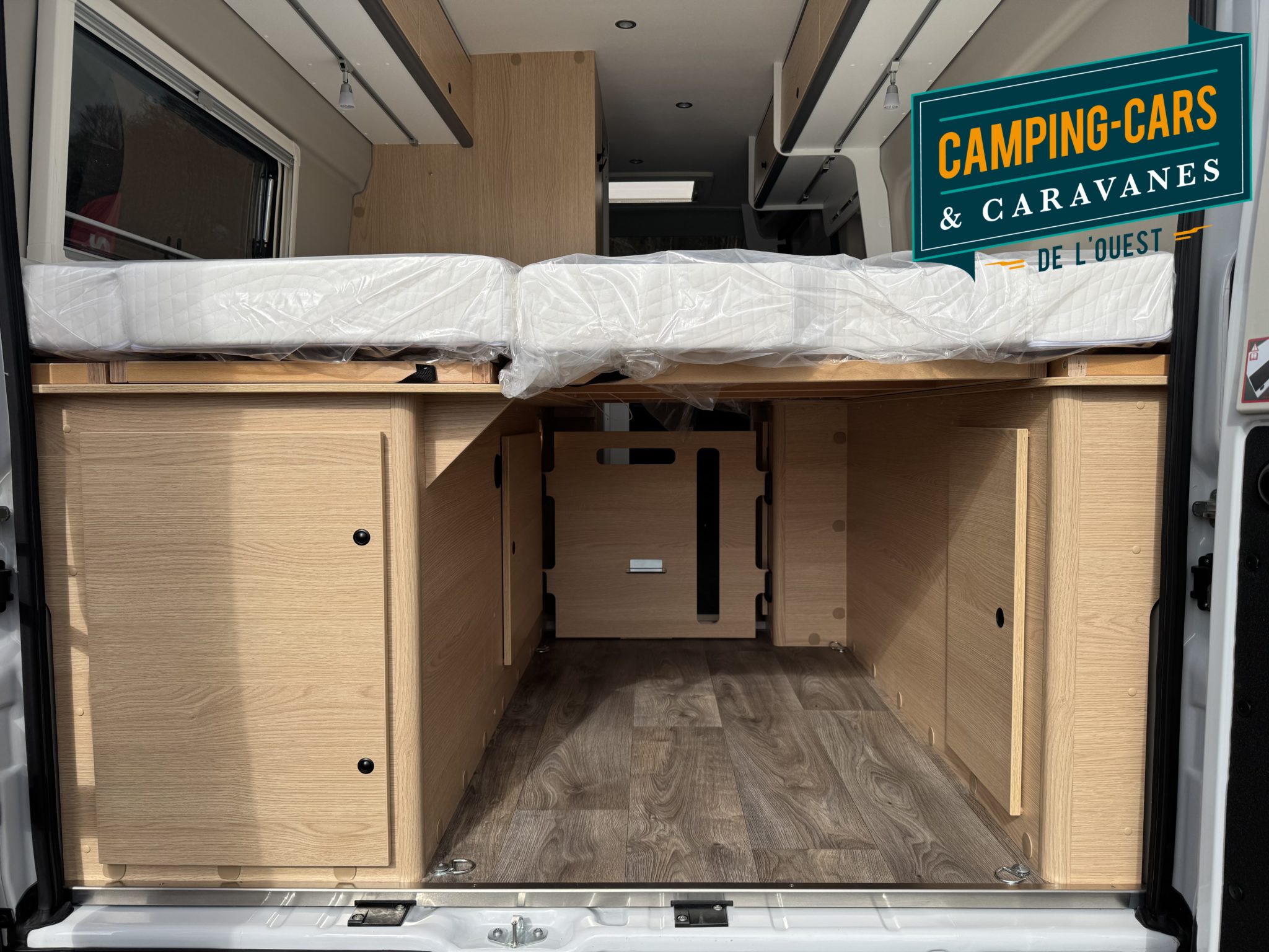 – Cloison incluant une marche pour accéder au lit double arrière